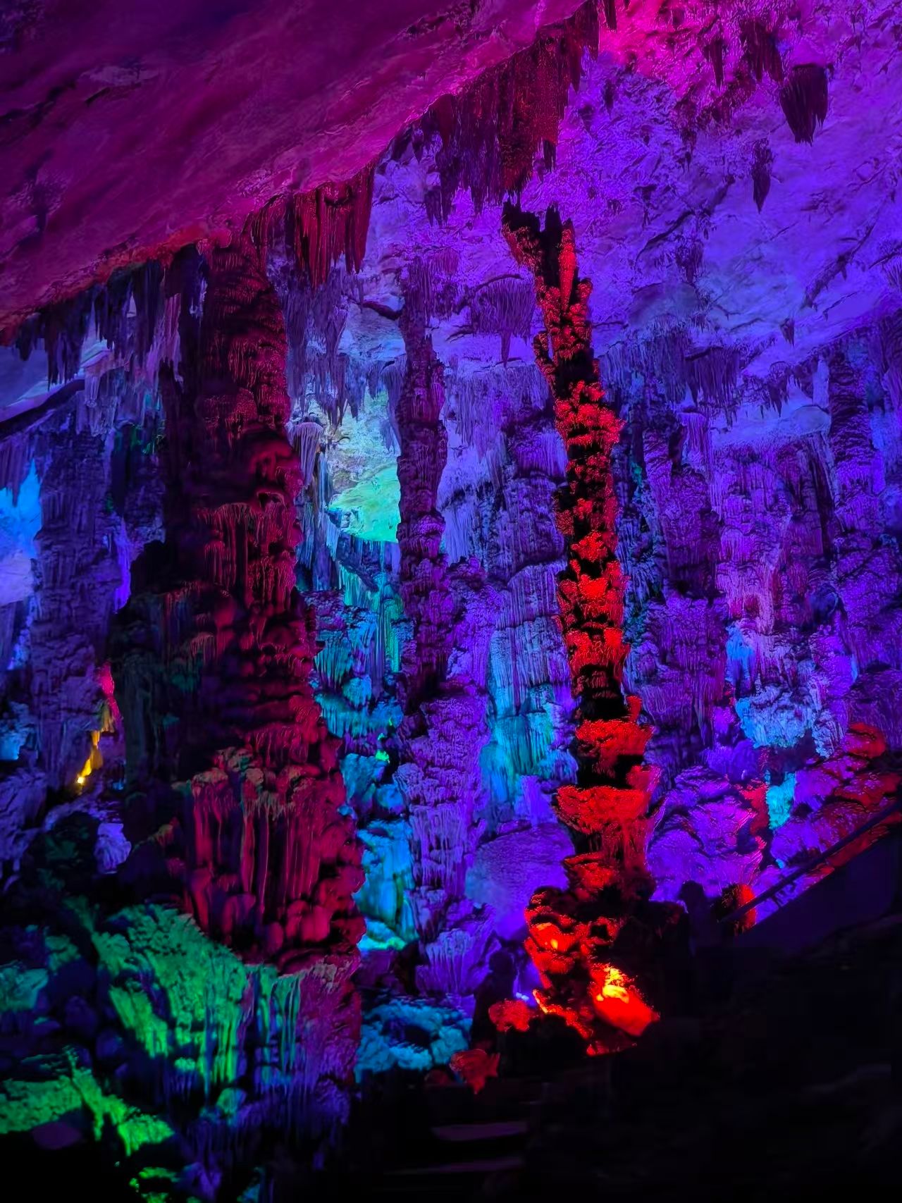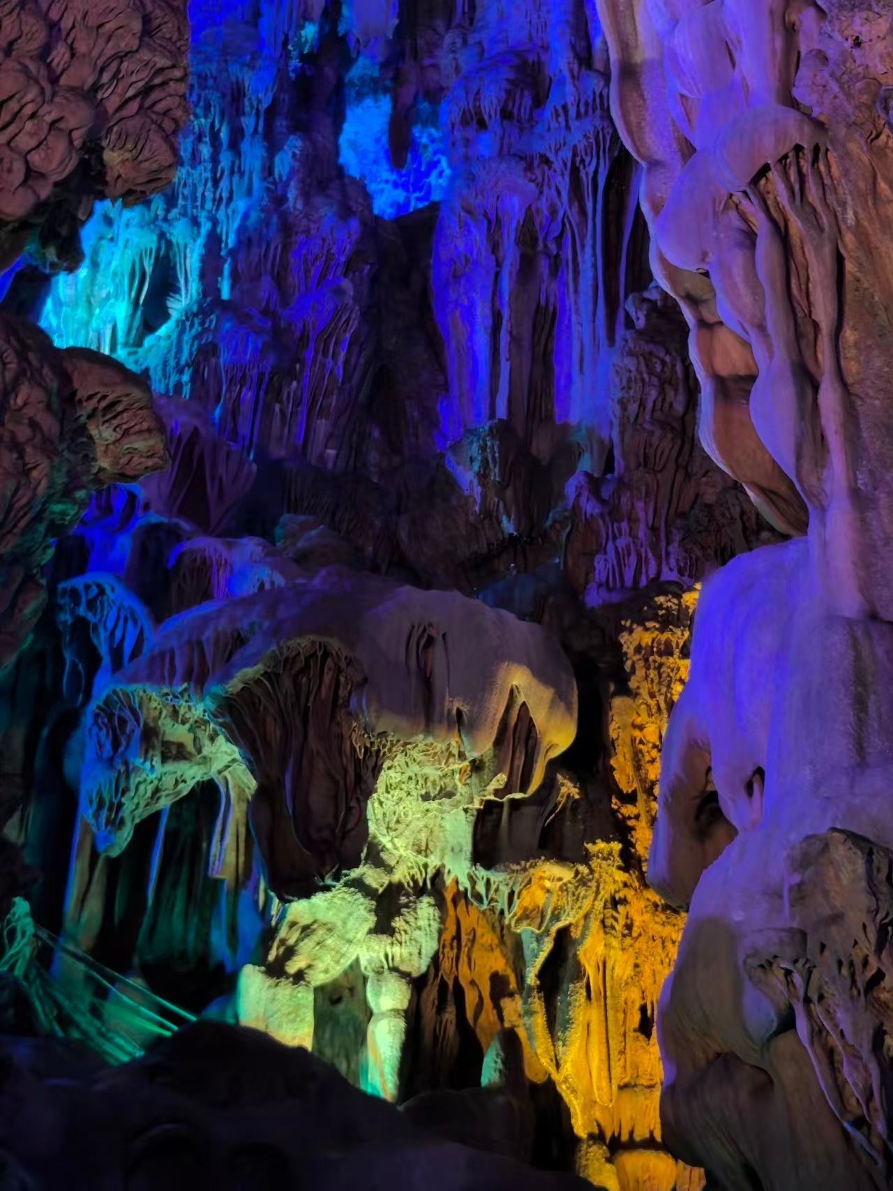 最后,同学们走进芦笛岩,开展地下喀斯特地貌探索与遥感影像认知实践。一方面近距离观察石钟乳、石笋、石柱、石幔等堆积地貌的形态特征与分布规律,结合溶洞内的水文条件,理解地下水的溶蚀、沉积作用在溶洞发育中的核心作用。