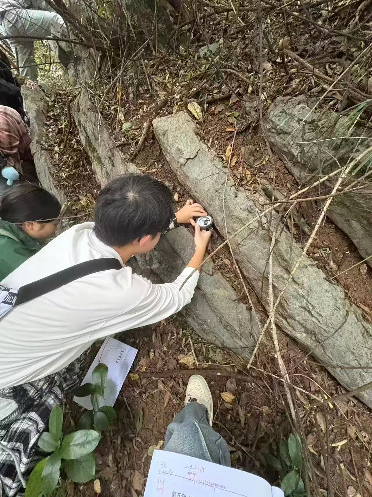 在沟圩山,同学们重点进行岩层接触关系识别。在老师引导下,同学们沿山体剖面追踪不同岩层的接触界面,识别整合接触、平行不整合等接触关系的典型特征,结合岩层的岩性差异与年代推断,分析区域地质演化过程中地层的沉积间断与构造运动痕迹,深化了对“岩层接触关系是地质历史的‘文字记录’”的认知。同时,同学们使用地质罗盘仪测量关键岩层的走向、倾向和倾角,规范记录数据,为分析岩层接触与构造运动的关联性提供了实证支撑。