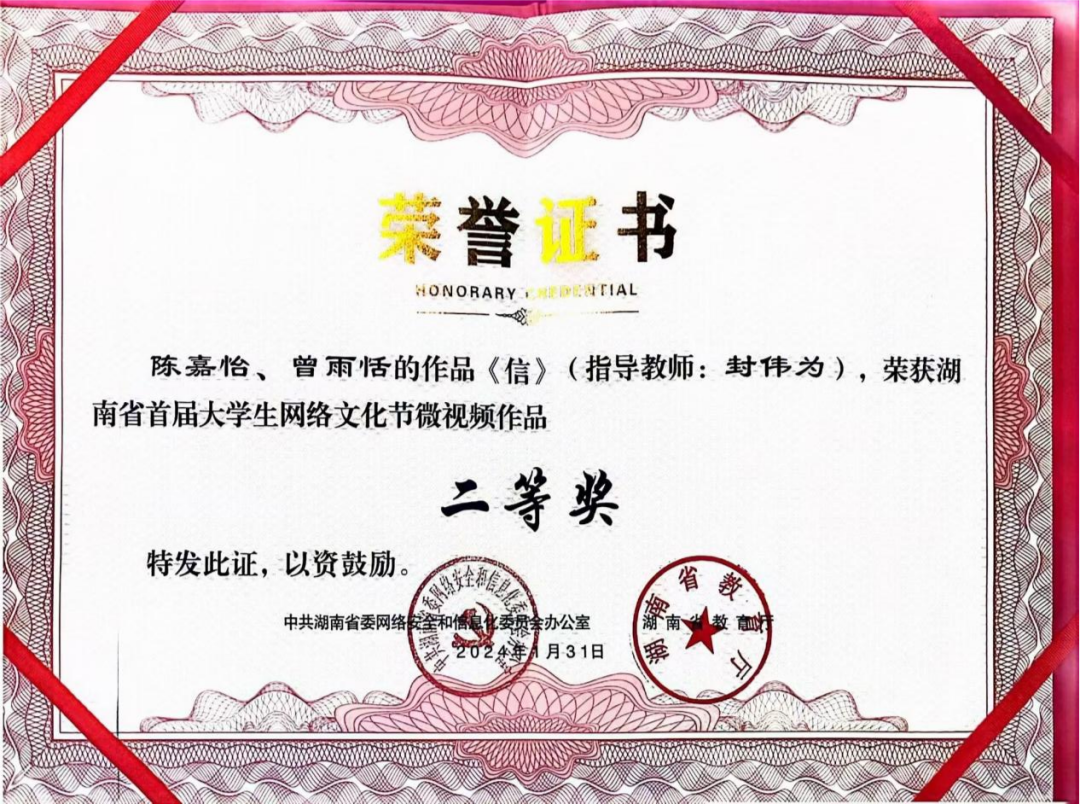 5.2024年荣获湖南省首届大学生网络文化节微视频作品二等奖