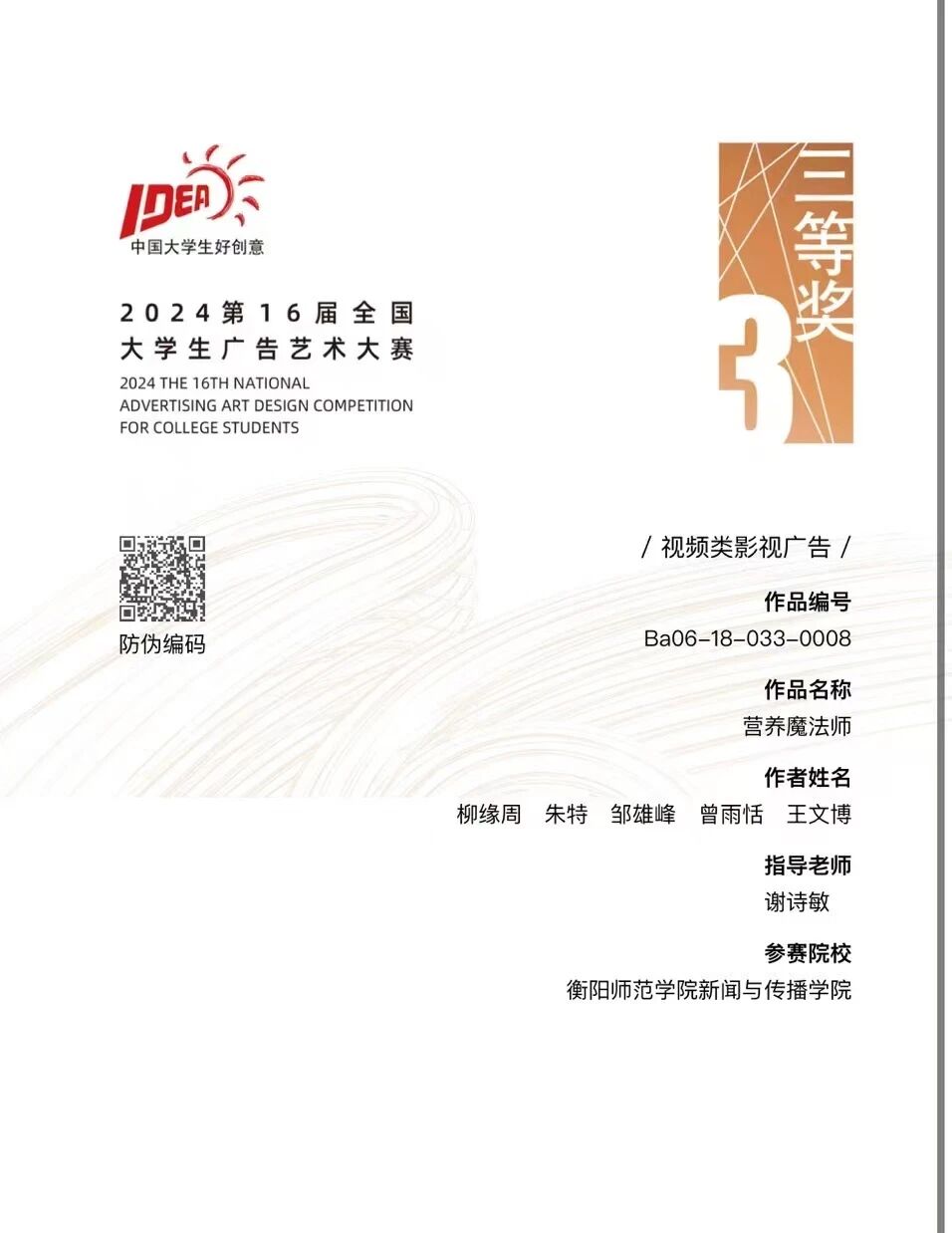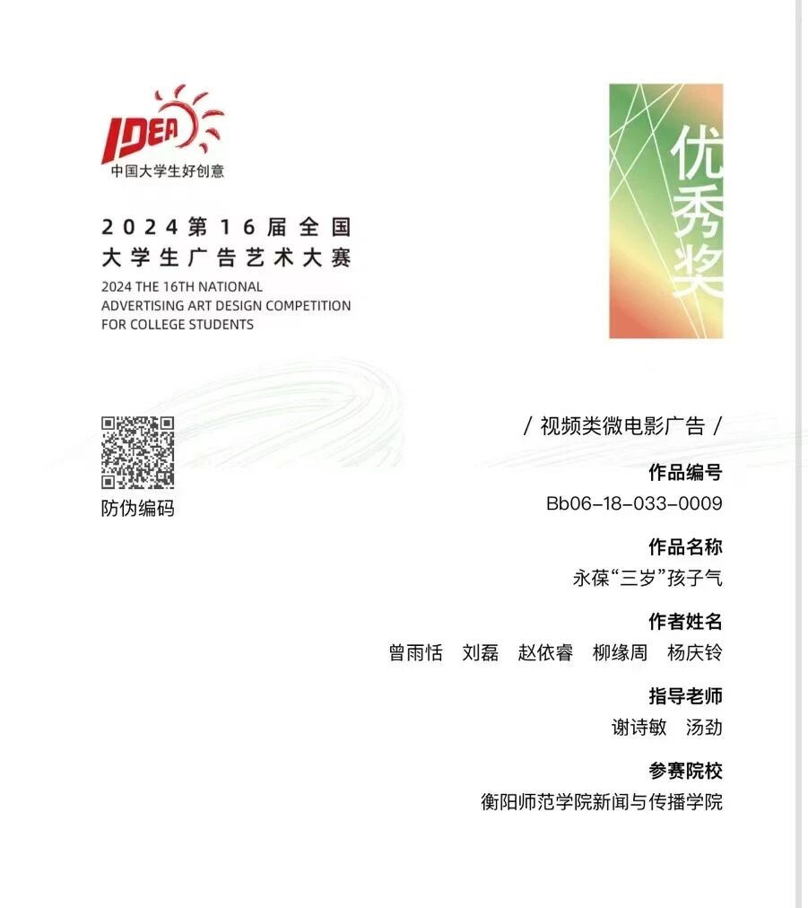 两项全国大学生广告艺术大赛三等奖