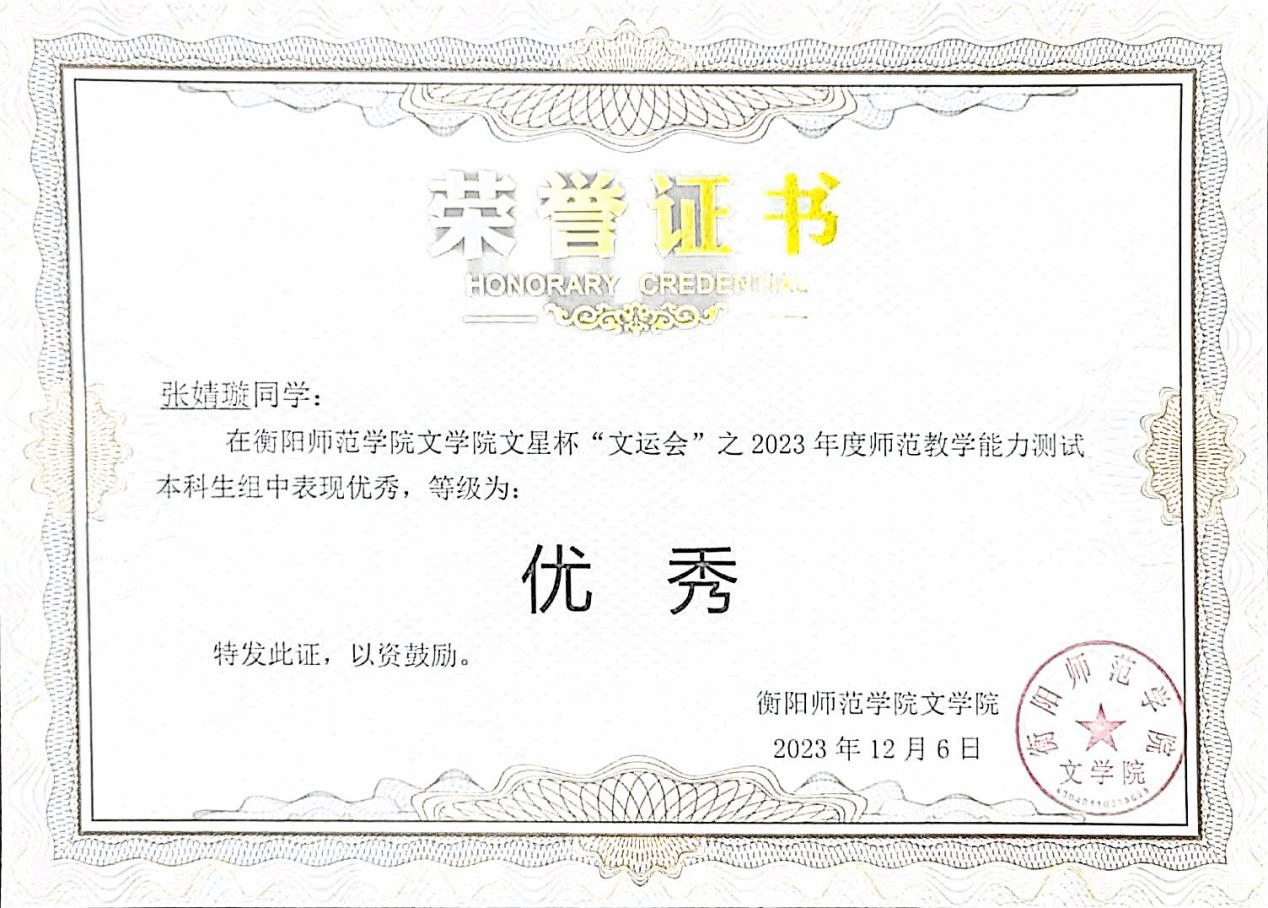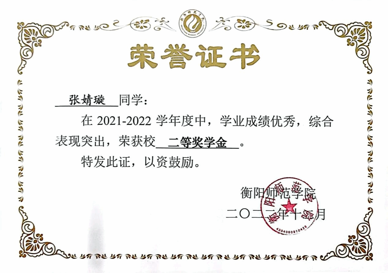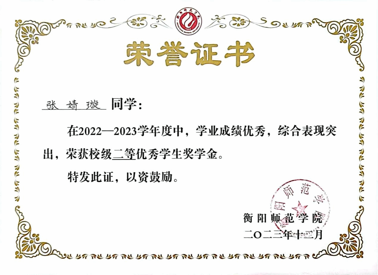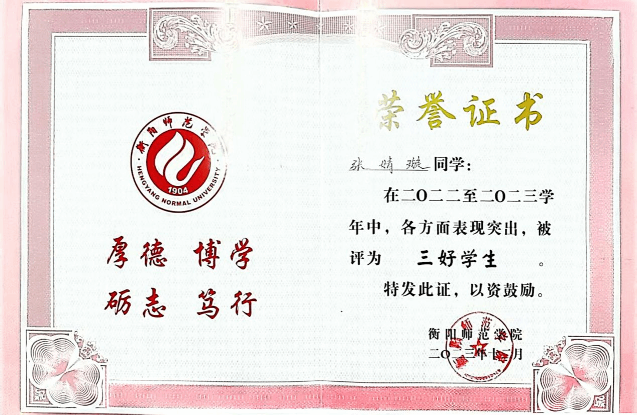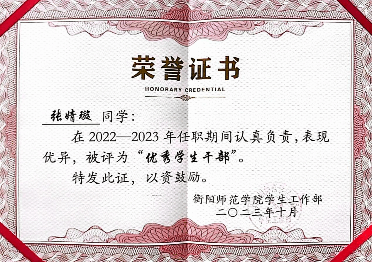 张婧璇同学连续两年荣获校级奖学金,被评为校级“三好学生”“优秀学生干部”,综合测评排名班级第一,学年成绩在本专业排名前3.125%,她顺利通过英语四、六级考试,已获得普通话二甲证书、计算机二级证书、高中语文教师资格证书等。