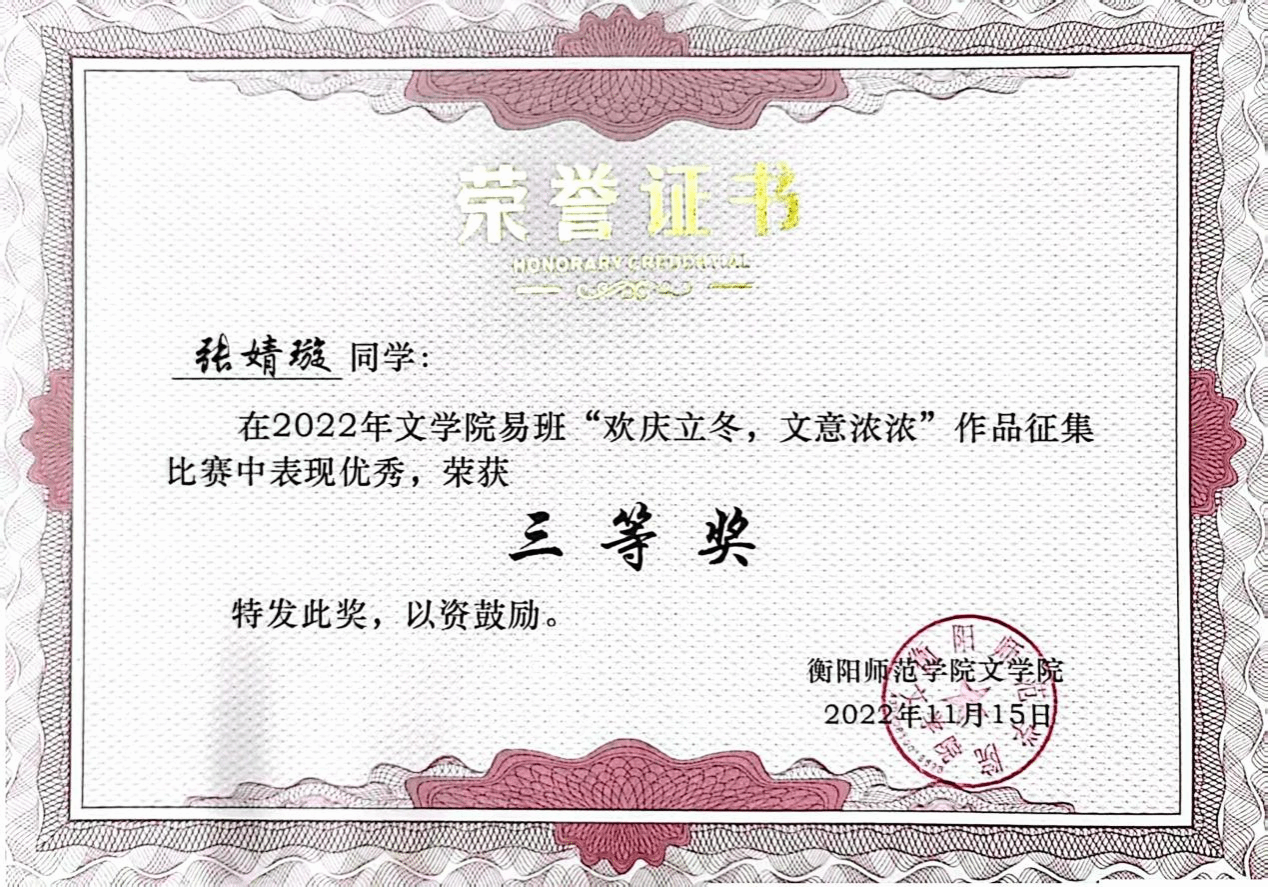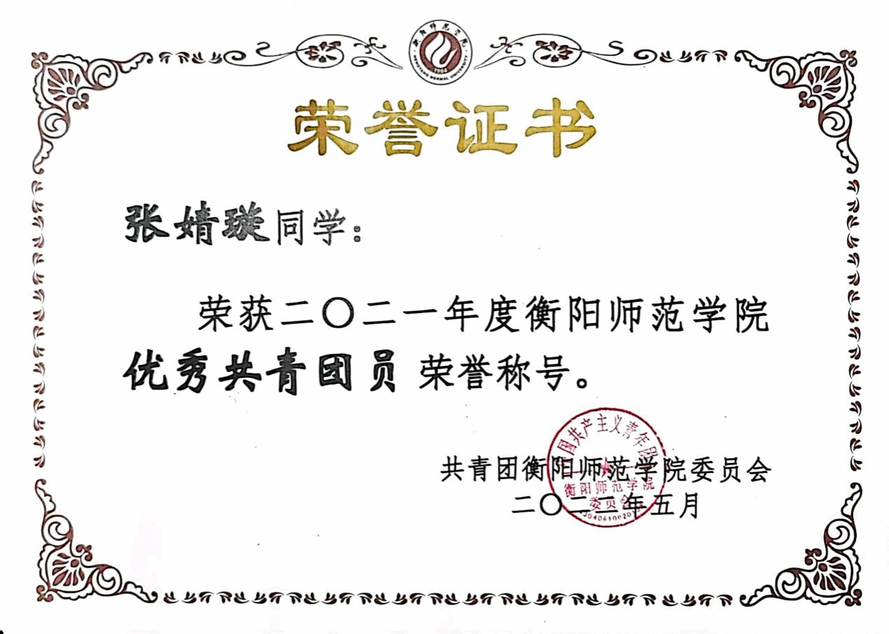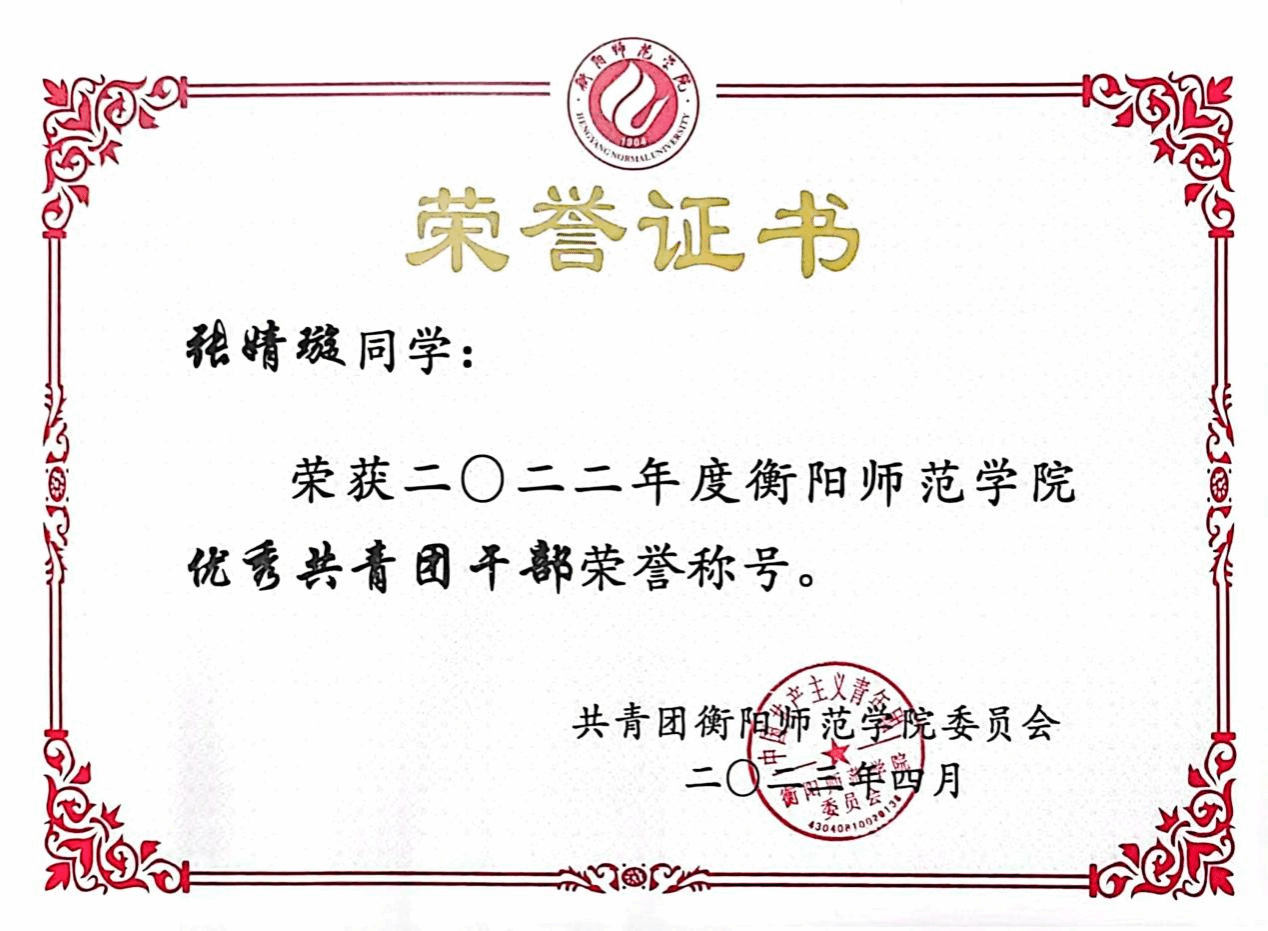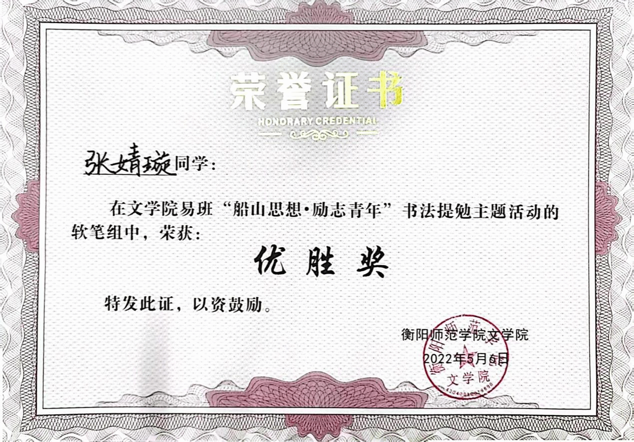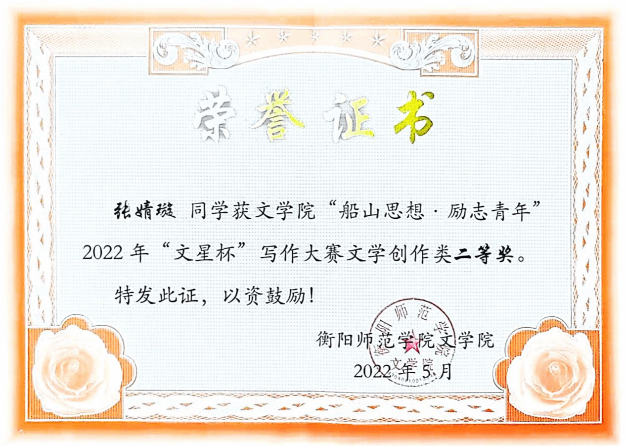 张婧璇同学连续两年荣获校级奖学金,被评为校级“三好学生”“优秀学生干部”,综合测评排名班级第一,学年成绩在本专业排名前3.125%,她顺利通过英语四、六级考试,已获得普通话二甲证书、计算机二级证书、高中语文教师资格证书等。