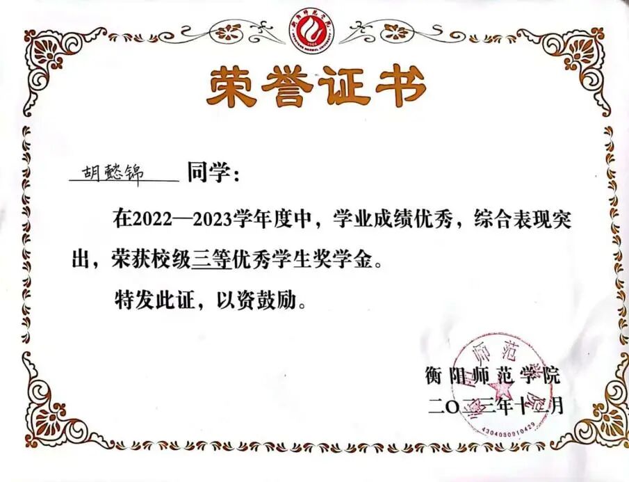 2023年获校优秀三等奖学金