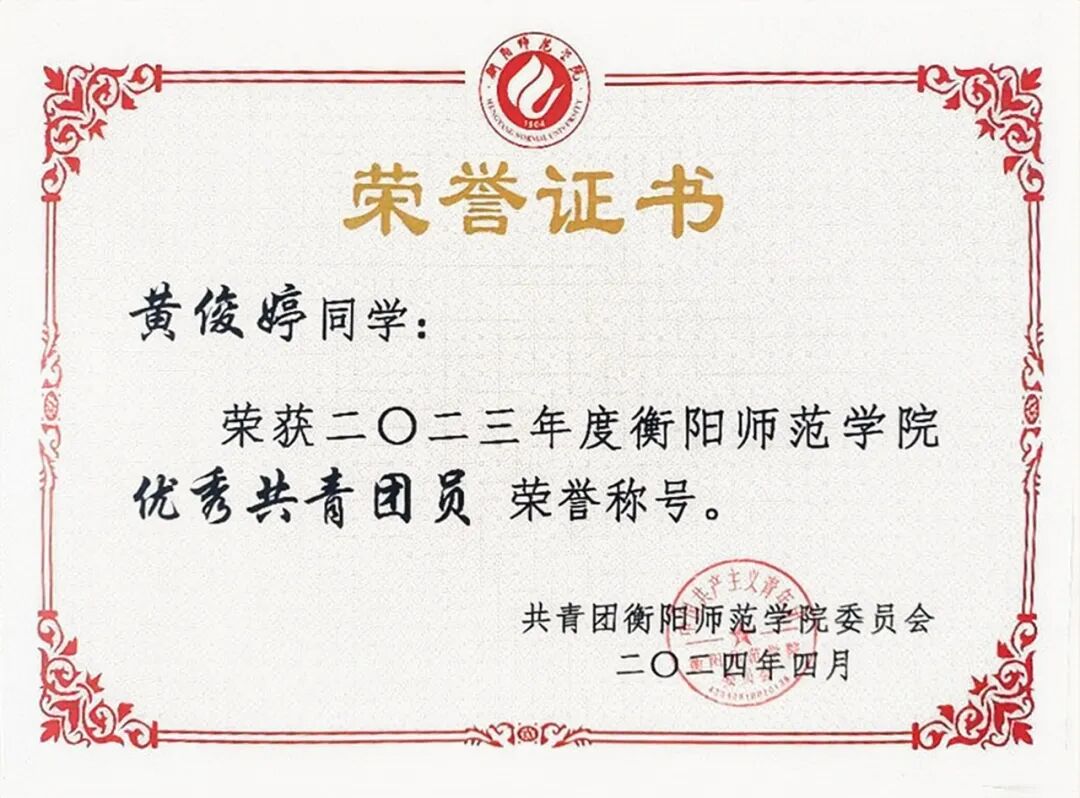 黄俊婷坚信知识能改变命运,用勤奋书写优异成绩;始终秉持奉献精神,以志愿服务传递温暖;坚持担当班级工作,为集体发光发热。她以实际行动告诉我们,困难是成长的养分,奋斗是青春的号角。身为衡师学子,我们应从她身上汲取力量,以平常心面对波折,以坚强意志跨越险阻,在学业和生活中奋勇向前,传承励志精神,为梦想拼搏,让青春在奋斗与奉献中熠熠生辉。