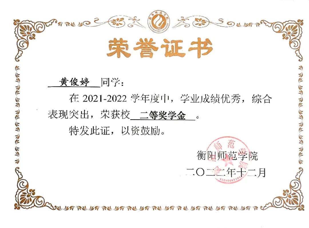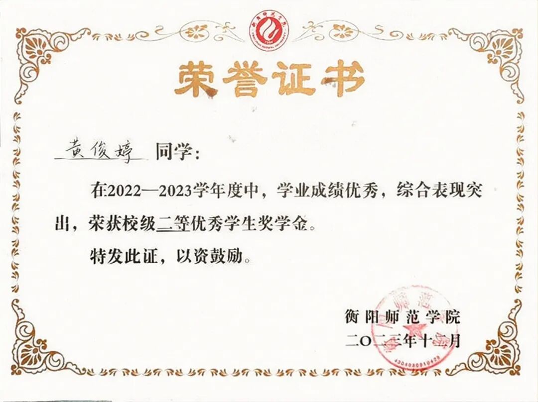 在学习的征程中,黄俊婷是勤奋的追光者。她深知学习是改变命运的关键,始终保持着认真刻苦的态度。课堂上,她全神贯注,不放过老师讲解的每一个知识点;课后,她主动钻研,广泛阅读专业书籍和文献,拓宽自己的知识面。凭借着这份努力,大一、大二年度她均荣获校级奖学金,这是对她学习成果的肯定。