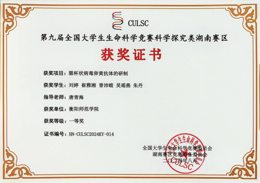 4.第九届全国大学生生命科学竞赛探究类湖南赛区一等奖