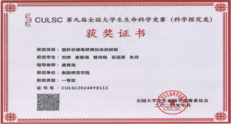 4.第九届全国大学生生命科学竞赛(科学探究类)一等奖