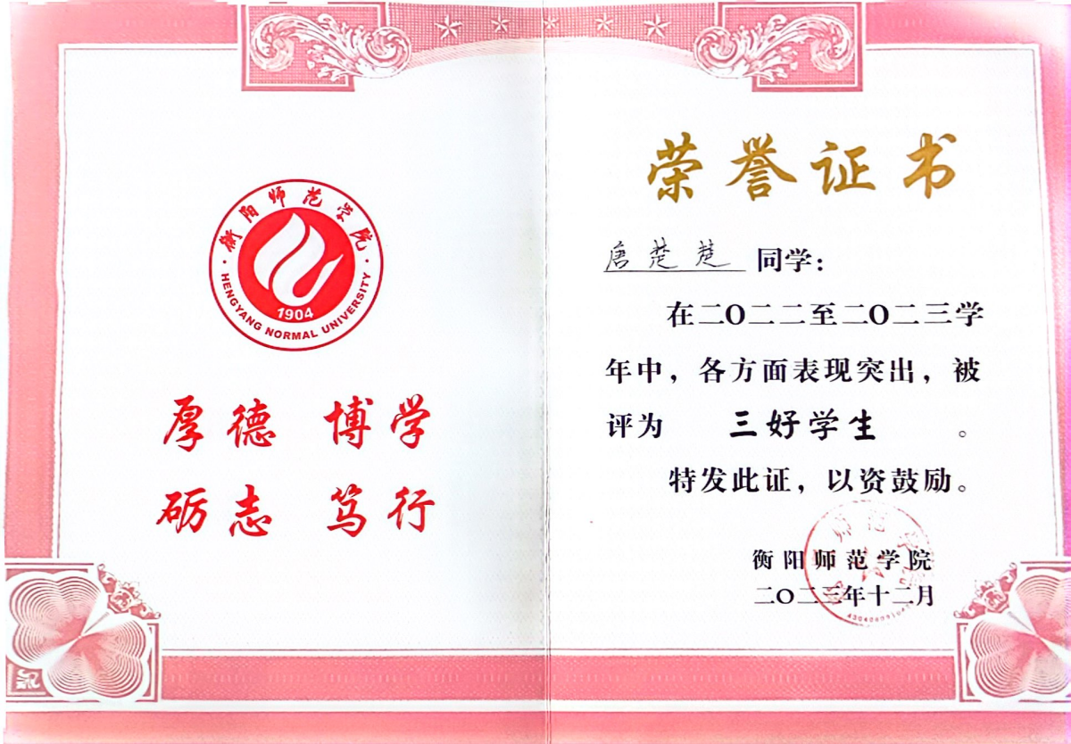 唐楚楚思想态度端正、锐意进取,热爱祖国与中国共产党,政治立场坚定。唐楚楚认为人生没有白走的路,每一步“笃行”都算数。她在大学期间认真学习了党的基本知识,并积极向党组织靠拢。在专业课的同时,唐楚楚也不忘努力提升自己其他方面的学习能力,考取了普通话二甲证书,英语四六级证书,教师资格证等,2021-2023年连续两年获“校一等奖学金”“校三好学生”荣誉奖励。与此同时,唐楚楚积极参与学科竞赛,在专业创新比赛方面有所成绩,于2023年荣获第九届全国大学生物理实验竞赛三等奖。