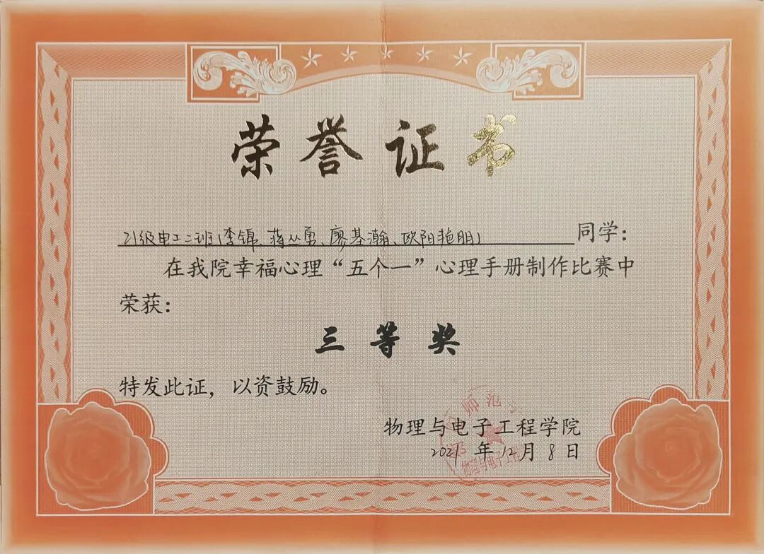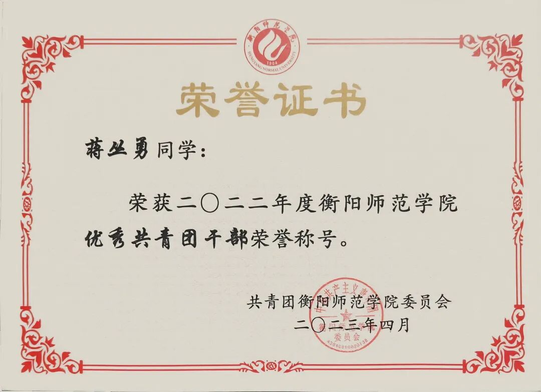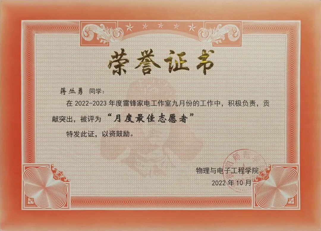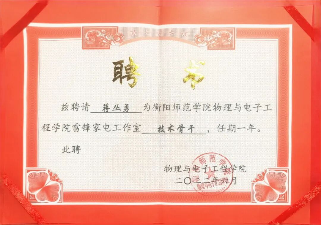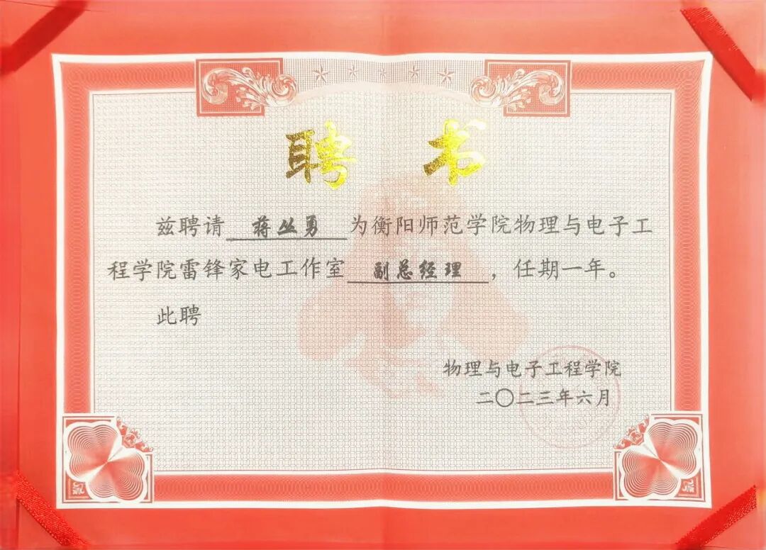 曾任干部经历:21级电子信息工程2班班长兼寝室长、雷锋家电工作室技术部助理、雷锋家电工作室技术部技术骨干、雷锋家电工作室副总经理、物理与电子工程学院学生第一党支部支部委员。