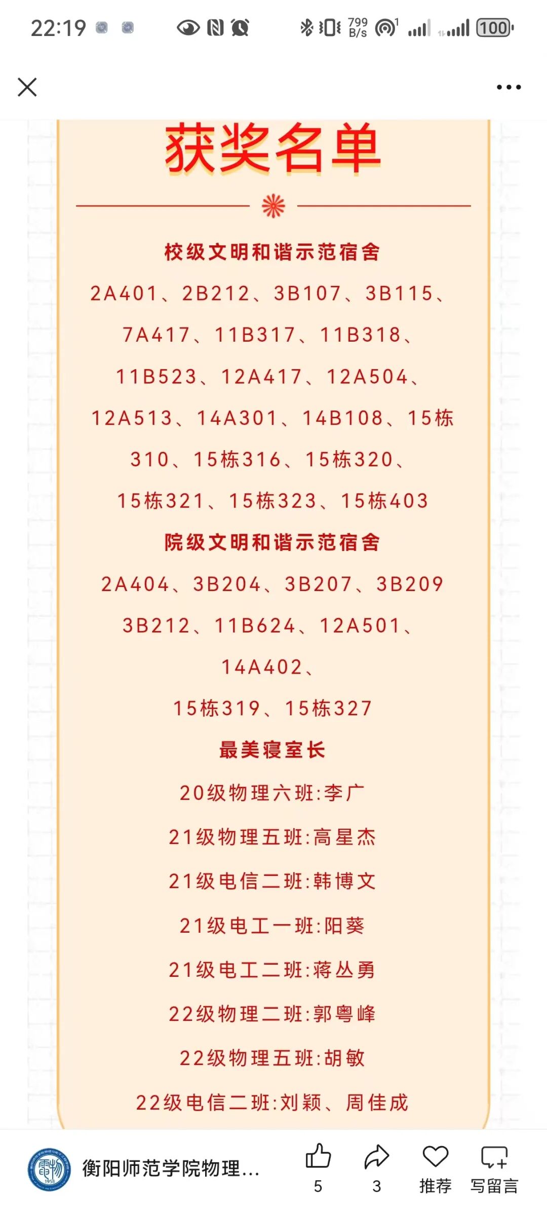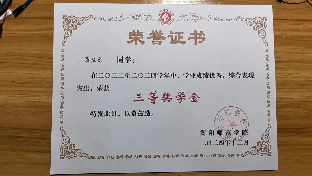 在物理与电子工程学院的青春画卷中,蒋丛勇以三重闪耀的身份,勾勒出新时代青年的责任与担当。作为雷锋家电工作室副总经理,他将大量时间投入工作室日常运营与技术钻研。与团队协同作业时,持续优化流程、积累经验。周末,他化身讲师,凭借丰富经验,以生动案例讲解维修理论,助力团队提升专业素养,推动工作室服务品质进阶;作为2021级电工2班班长,他精心策划每次班会,创新设计主题与互动环节,提升班会质量。同时主动搭建师生沟通桥梁,及时收集同学建议,准确传达教师要求;作为寝室长,他以细腻的关怀化身为温暖的“大家长”,与室友们齐心协力,打造温馨舒适的寝室生活环境。在他的统筹与引领下,寝室多次荣获“文明和谐示范寝室”的荣誉。2023年,在物理与电子工程学院举办的文明和谐宿舍文化活动中,一举摘得“最美寝室长”称号,成为老师与同学心中值得信赖的“主心骨”,用行动诠释责任与担当。