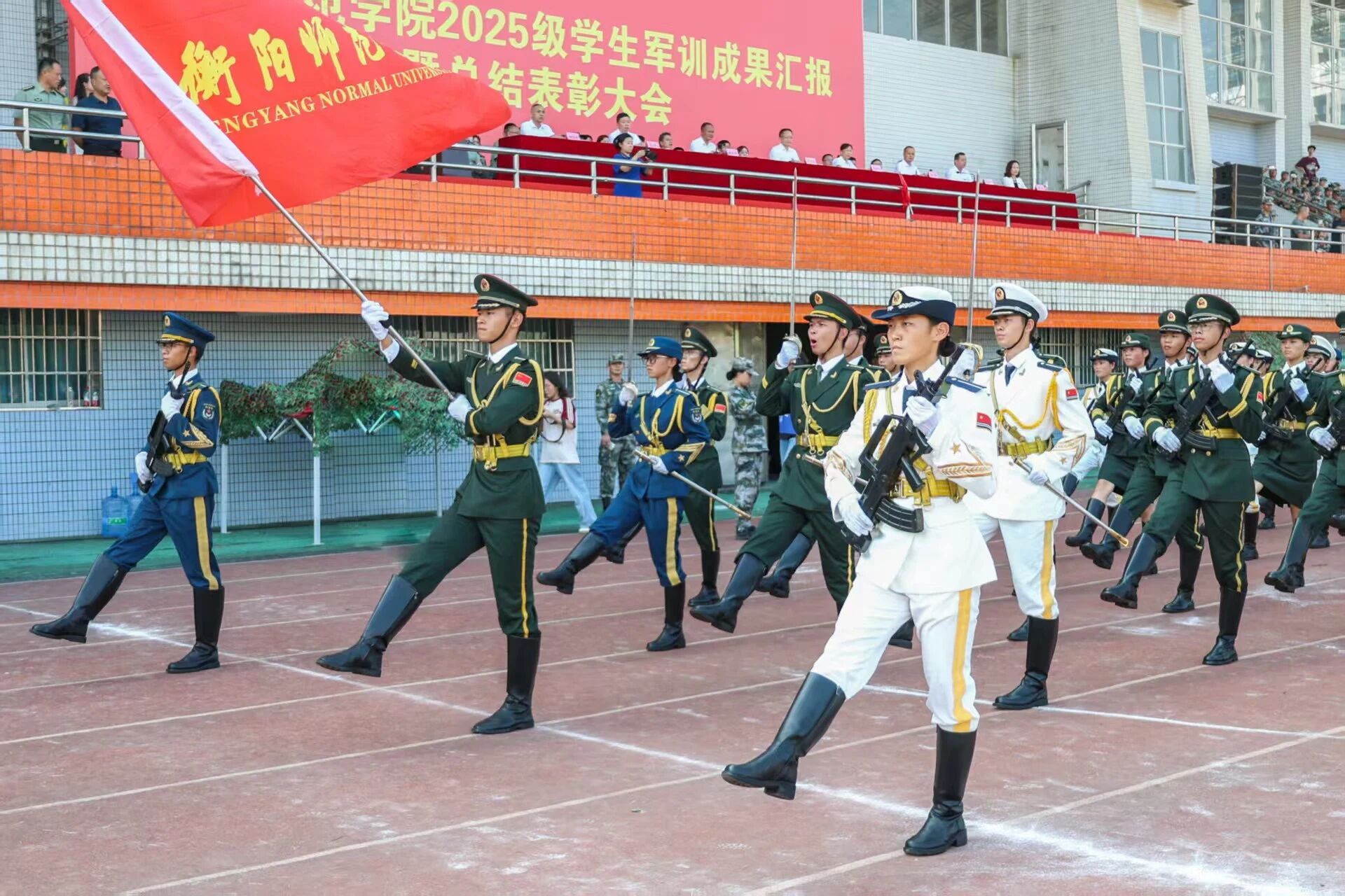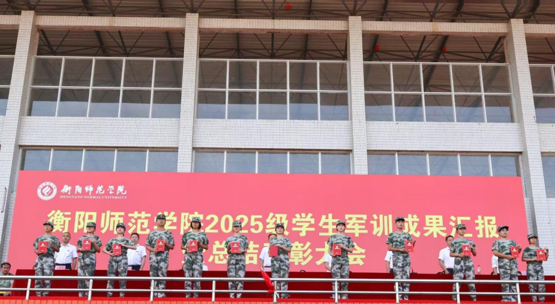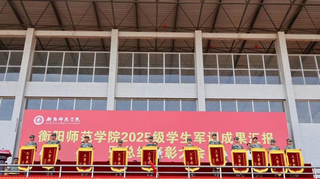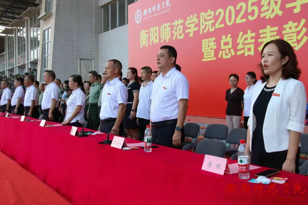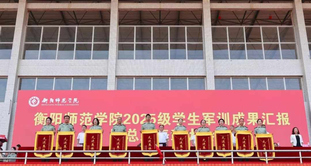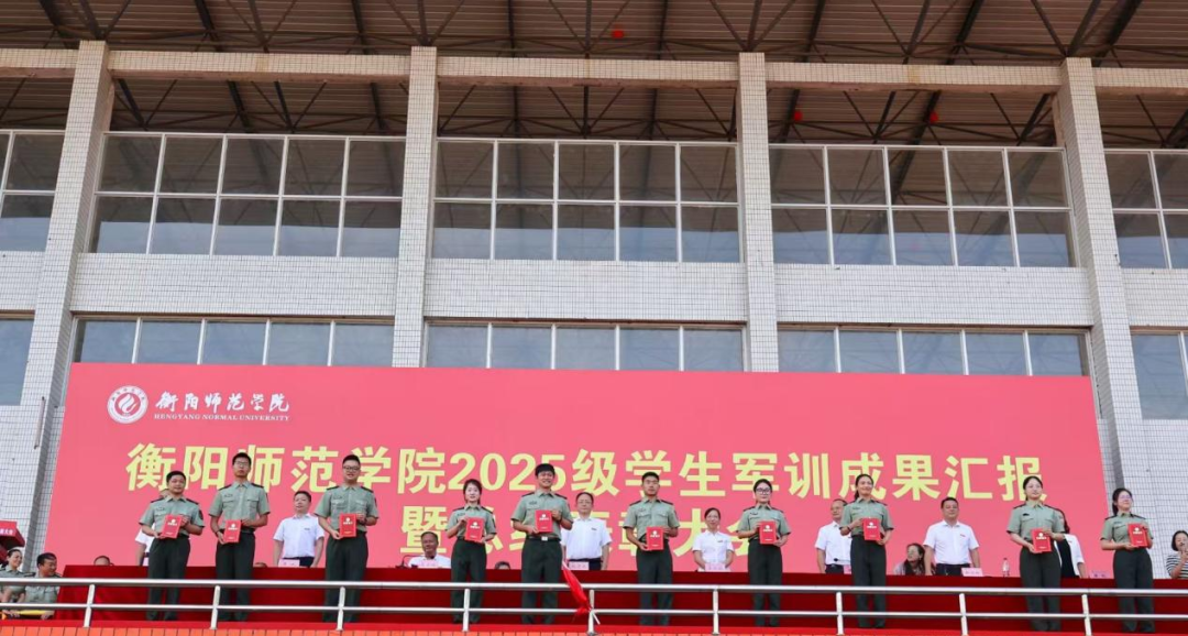 9月29日下午三点,衡阳师范学院2025级学生军训成果汇报暨总结表彰大会在东校区风雨田径场举行。党委书记刘子兰,副校长李玲玲,党委副书记陈敏,纪委书记李斌,副校长魏晓林、唐芳贵,党委委员、组织部部长唐艳出席总结表彰大会。副校长聂东明主持本次会议。学校军训工作领导小组成员、院党总支书记、副书记、学工办主任、新生辅导员、军训教官和2025级全体新生共同参加本次大会。