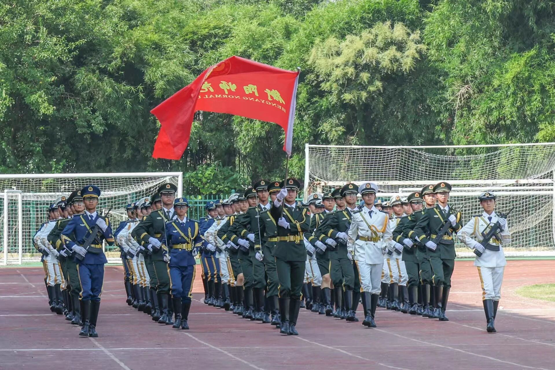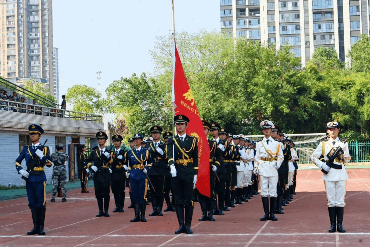 校旗护卫队成员肩扛校旗,迈着铿锵有力的步伐走向会场,挺拔身姿中尽显使命担当;手持礼枪的队员神情肃穆,目光如炬,举手投足间彰显军人般的飒爽风范,为大会拉开充满仪式感的序幕。