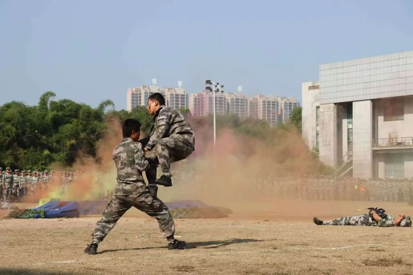 教官们的军体拳表演行云流水,每一个格斗动作都攻防兼备,将精湛的实战技能展现得淋漓尽致。招式交错之间,不仅体现出专业的军事素养,更向新生传递了坚韧不拔、永不言弃的精神品质,为学子们树立了优秀榜样。