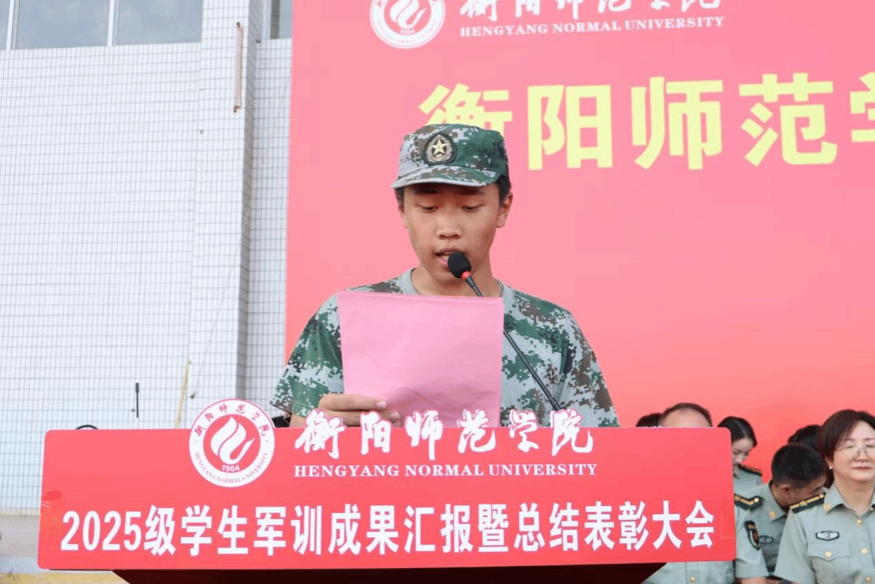 新闻与传播学院2025级广告学专业学生屈志威作为军训学生代表发言。他深情回顾了为期一段时间的军训历程,感恩学校的精心组织与学长学姐的暖心关怀,并分享了自己在军训中收获的成长与感悟。同时,他表达了对大学生活的美好憧憬,表示将以衡阳师范学院“厚德、博学、砺志、笃行”的校训为指引,在专业学习与多元校园活动中积极进取,以青春之力书写精彩未来。