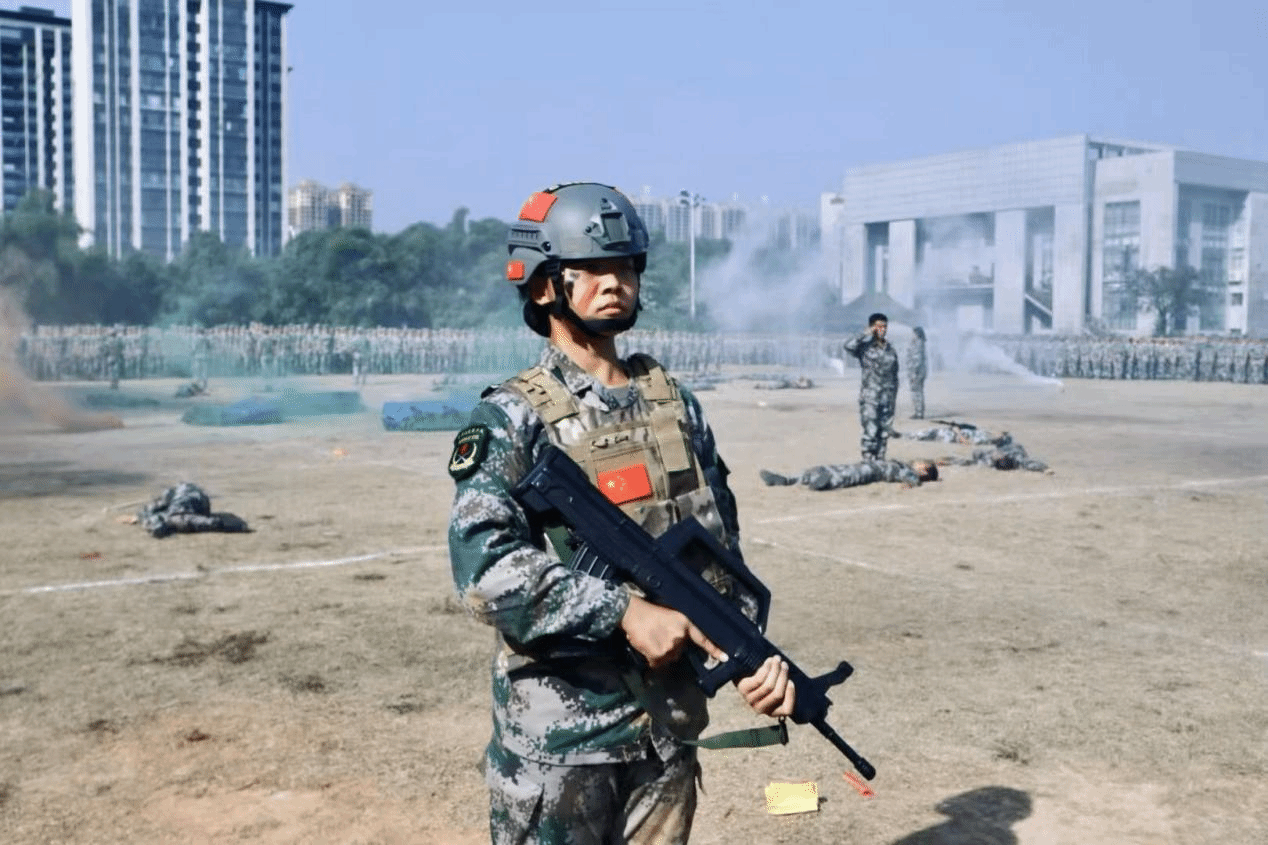 警报声突然响起,一场模拟实战的反恐演练迅速展开。参演队员反应迅捷、战术配合默契,有条不紊地完成战术部署与应急处置;战场救护环节中,规范的救护操作与高效的协作,为新生上了一堂生动的安全教育课,让维护安全的意识警钟长鸣于心。